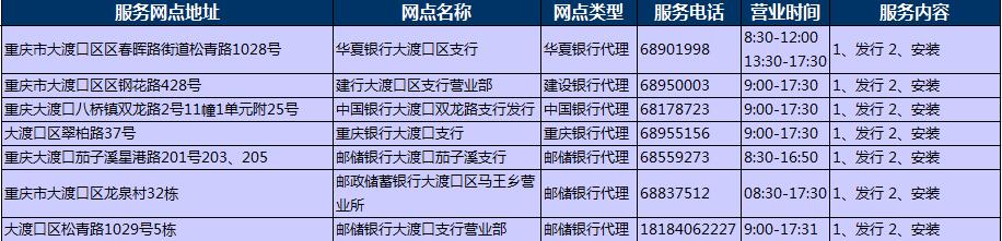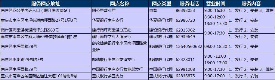 | 四公里網(wǎng)點 | 86376190 | 全年無休【9:00 - 16:30】 | 南岸區(qū)四公里內(nèi)環(huán)入口(原江南收費站) |