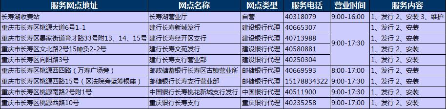| 長壽湖網(wǎng)點 | 40318079 | 周一至周五【9:00 - 16:00】 | 長壽湖收費站 |