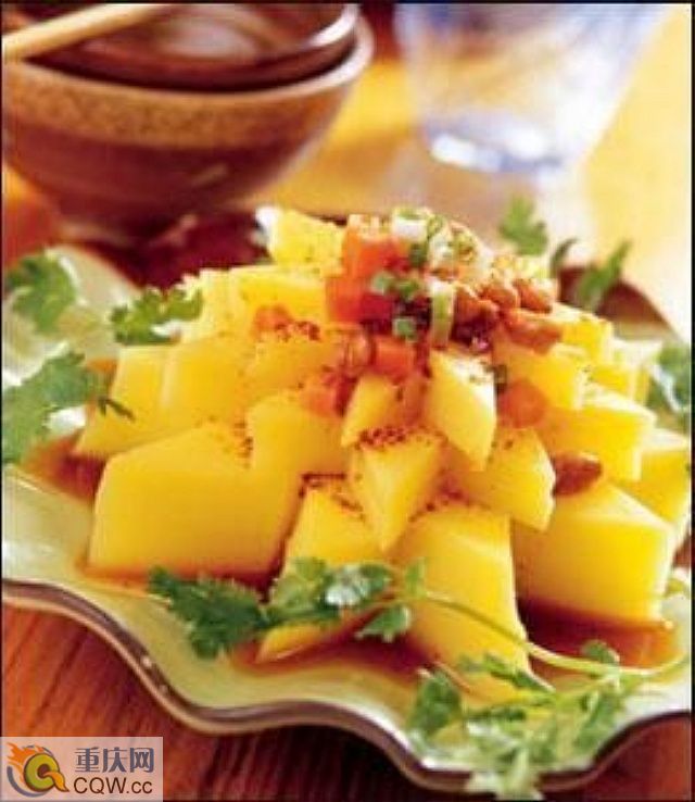 秀山著名的小吃,它是用大米淘洗浸泡后加水磨成米漿,然后大火熬制,做成“豆腐”。吃時切片放入盤內,再將切好的大頭菜、鹽菜、酥黃豆、酥花生、蔥花放于米豆腐上,用小碗放入紅油、麻油、花椒油、醬油、醋、姜汁、蒜水等調料對成汁,澆淋于米豆腐上即可。